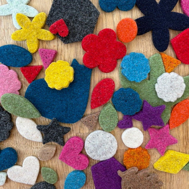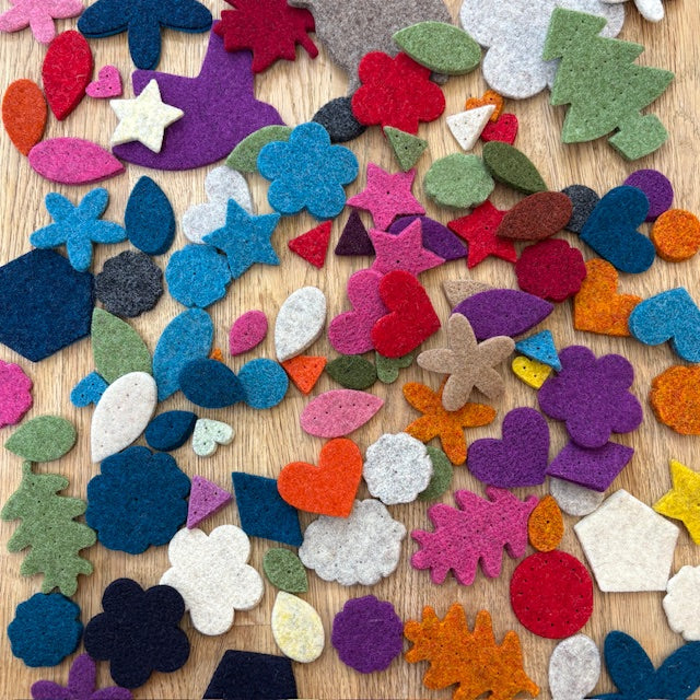 A random mix of at least 50 or 100 pieces depending on your chosen option. Felt flowers, smaller hearts, spots, stars, petals and more! All cut from our thick wool felt. Great for all sorts of craft projects, making brooches, badges, trimming hats and bags and, of course, adding a finishing touch to your Joe's Toes slippers.