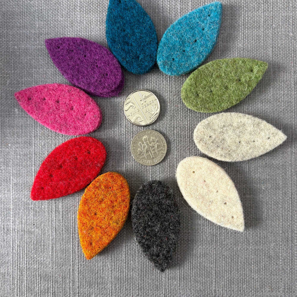 Flowers from felt, felt trees and felt maple leaves are just a few of the shapes in this exciting collection of felt nature shapes. Made from our thick wool felt, these felt flowers, petals and leaves shapes are available in a variety of different colours, designs and sizes. Many of these nature-inspired wool felt shapes come with pre-punched holes for easy stitching, perfect for repairing and embellishing bags and garments, and adding to our wool felt slippers!