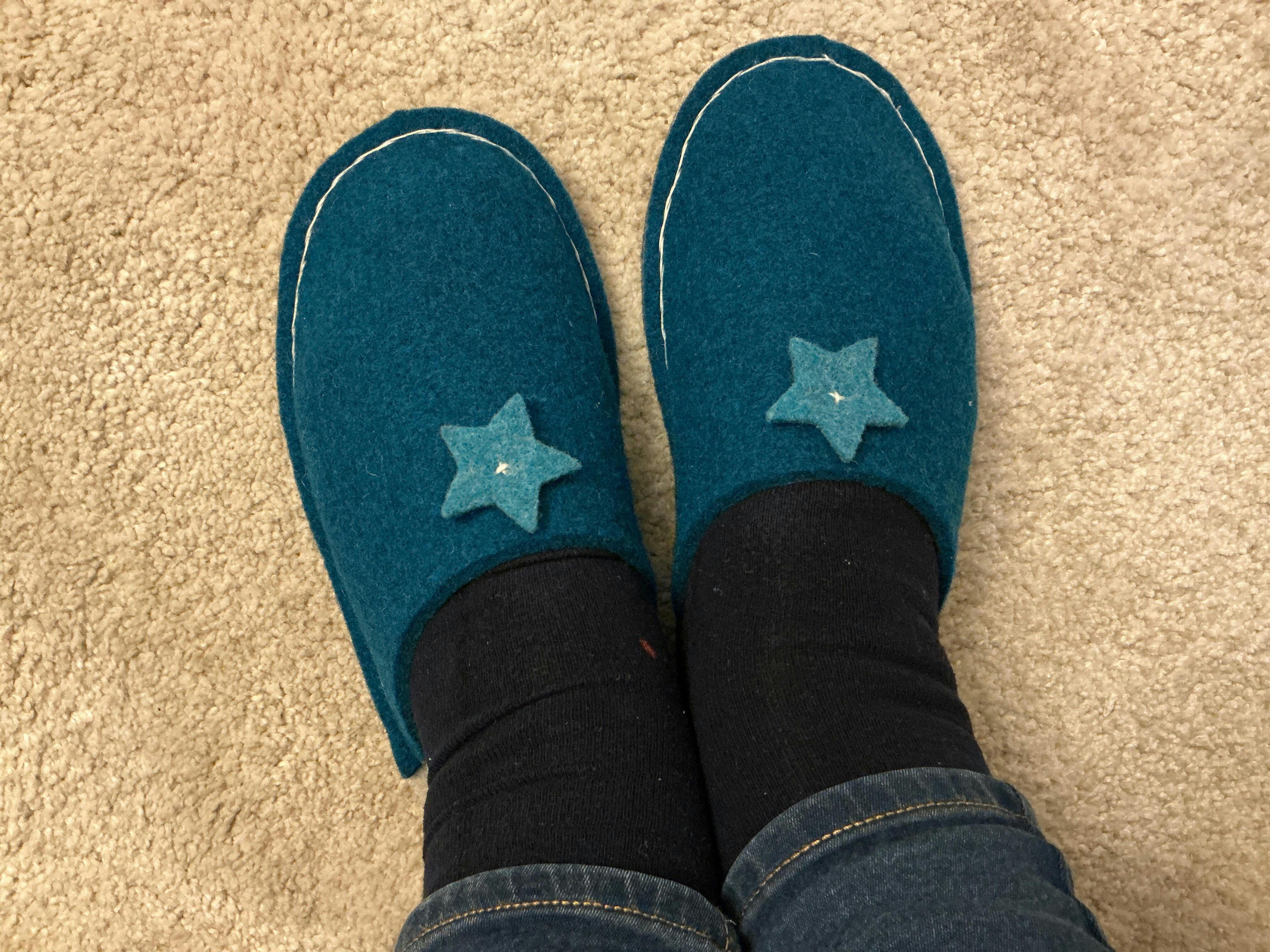 I love these teal and grey felt slippers. They were made easily and quite quickly. I love the little toning Star cut out, which now adorns the slipper top. It is an easy website to use, and they were quick and clear in email contact. Very highly recommended. I’m going to make more!